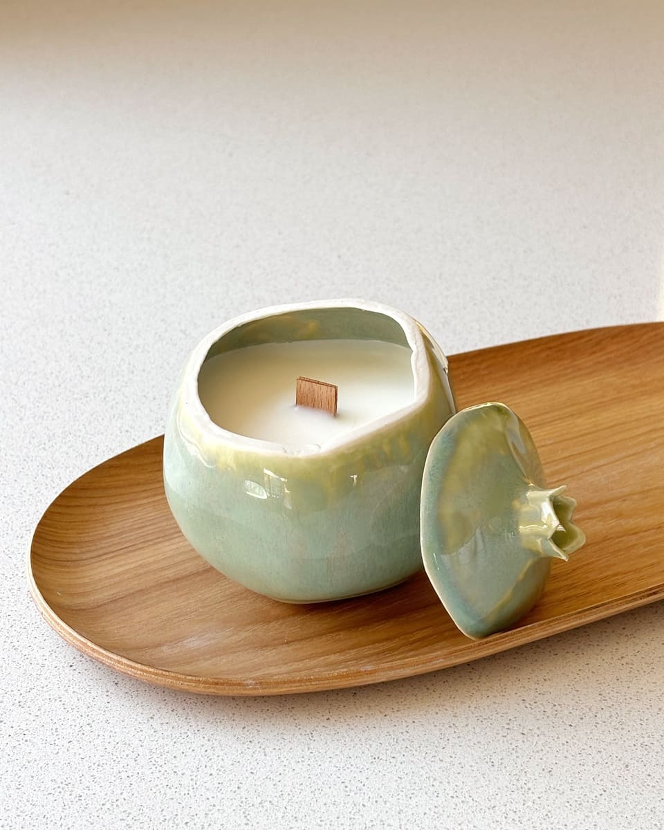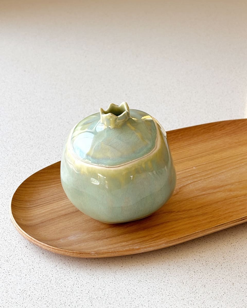 The container is shaped like a pomegranate, handcrafted in green-glazed porcelain.