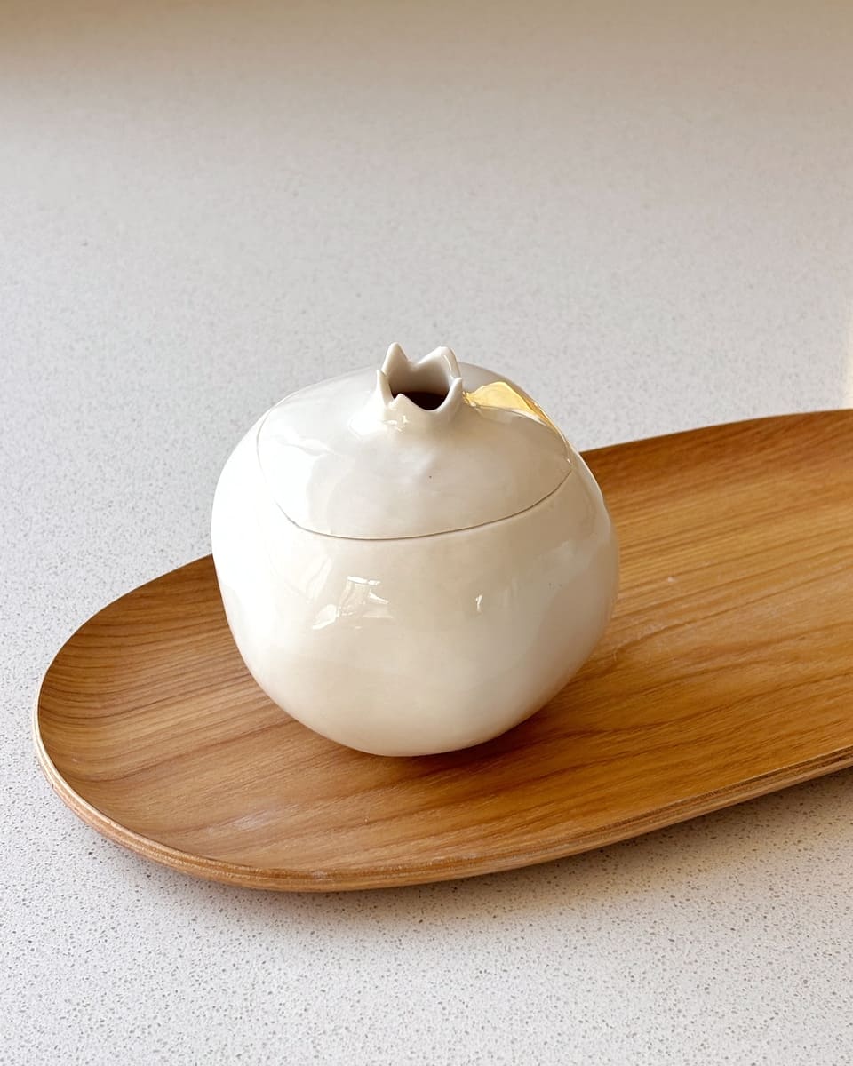 The container is shaped like a pomegranate, handcrafted in white-glazed porcelain.