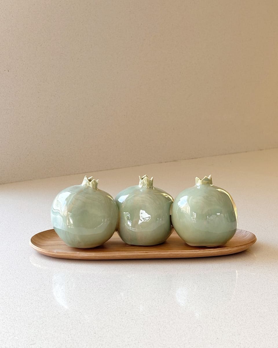 Porcelain piece featuring three joined pomegranates. Glossy white finish.