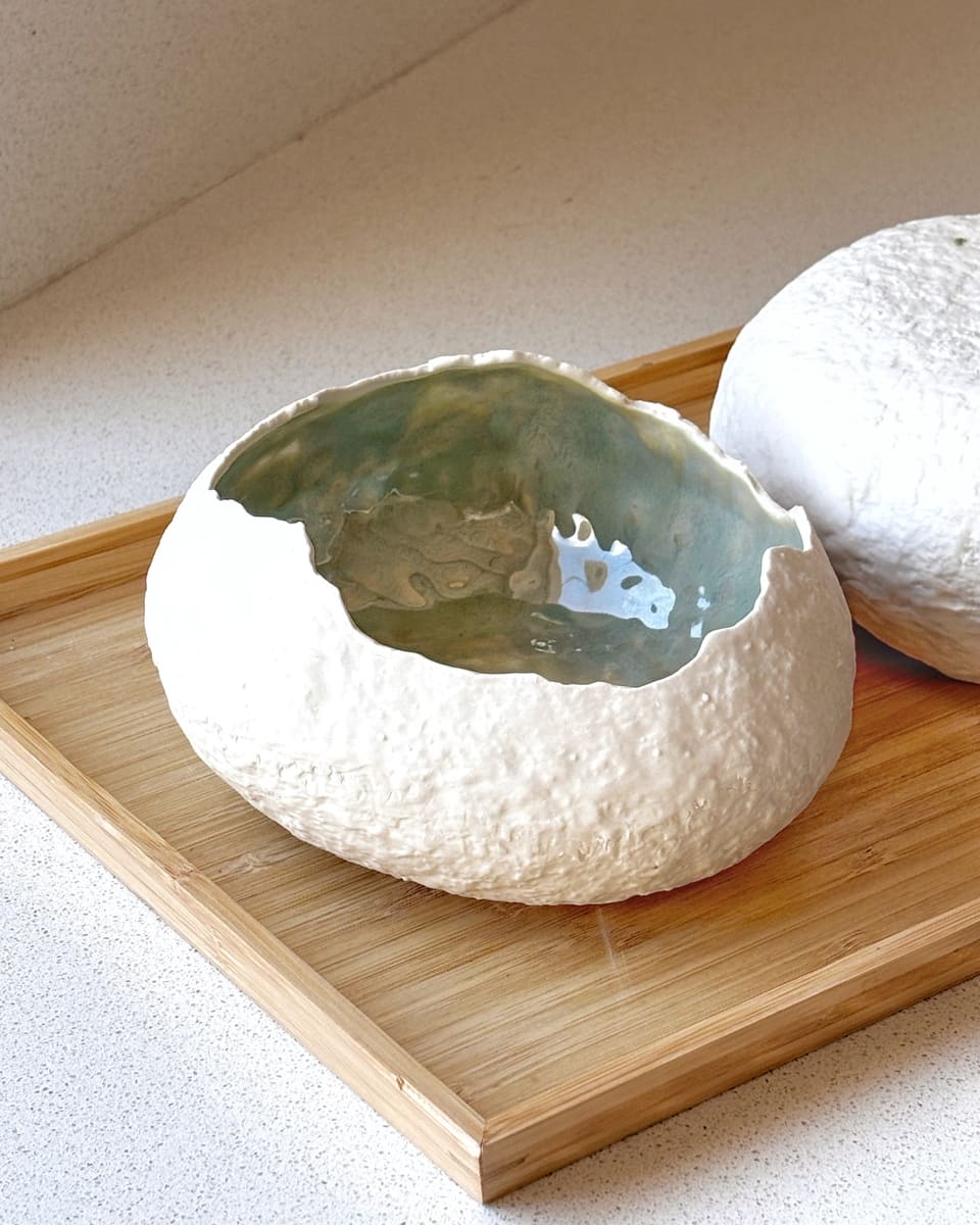Glazed only on the inside in glossy green, while leaving the natural biscuit texture on the outside.
