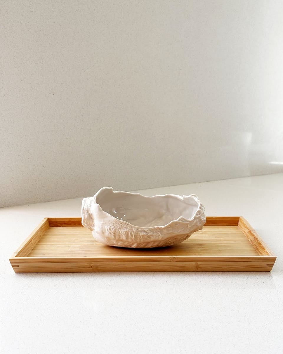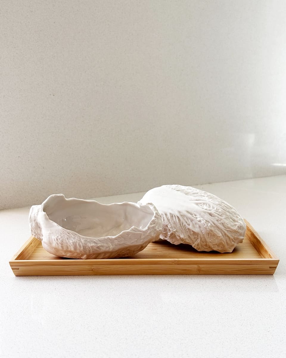 Made using a plaster mold created by me from a natural Napa cabbage leaf.